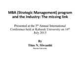 (Kabarak University, 2015)The corporate world is continuously seeking for highly qualified MBA graduates from the best universities. The GoK through Commission for University Education is increasingly compelling universities to review their MBA ... -